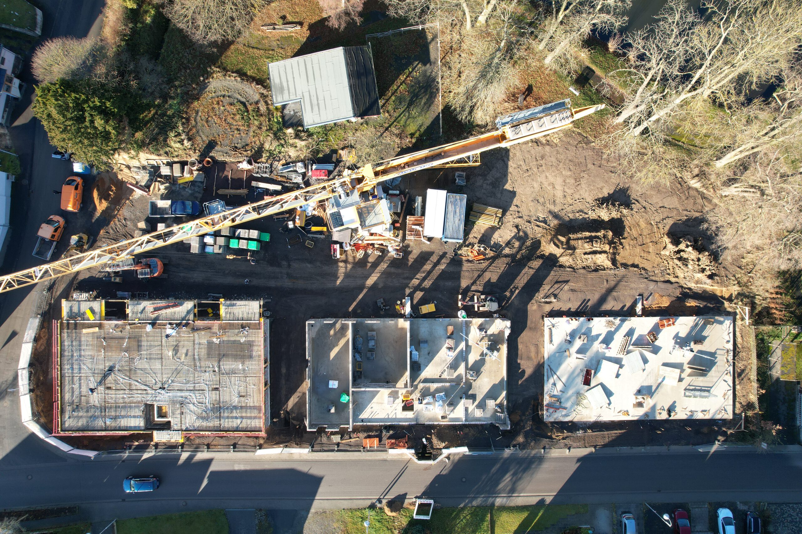 Die Rohbaumaßnahmen in Haus 1 und Haus 2 schreiten voran. Die tragenden Wände der ersten Baukörpersektion sind hochgezogen, was eine solide Basis für die folgenden Geschossarbeiten schafft.