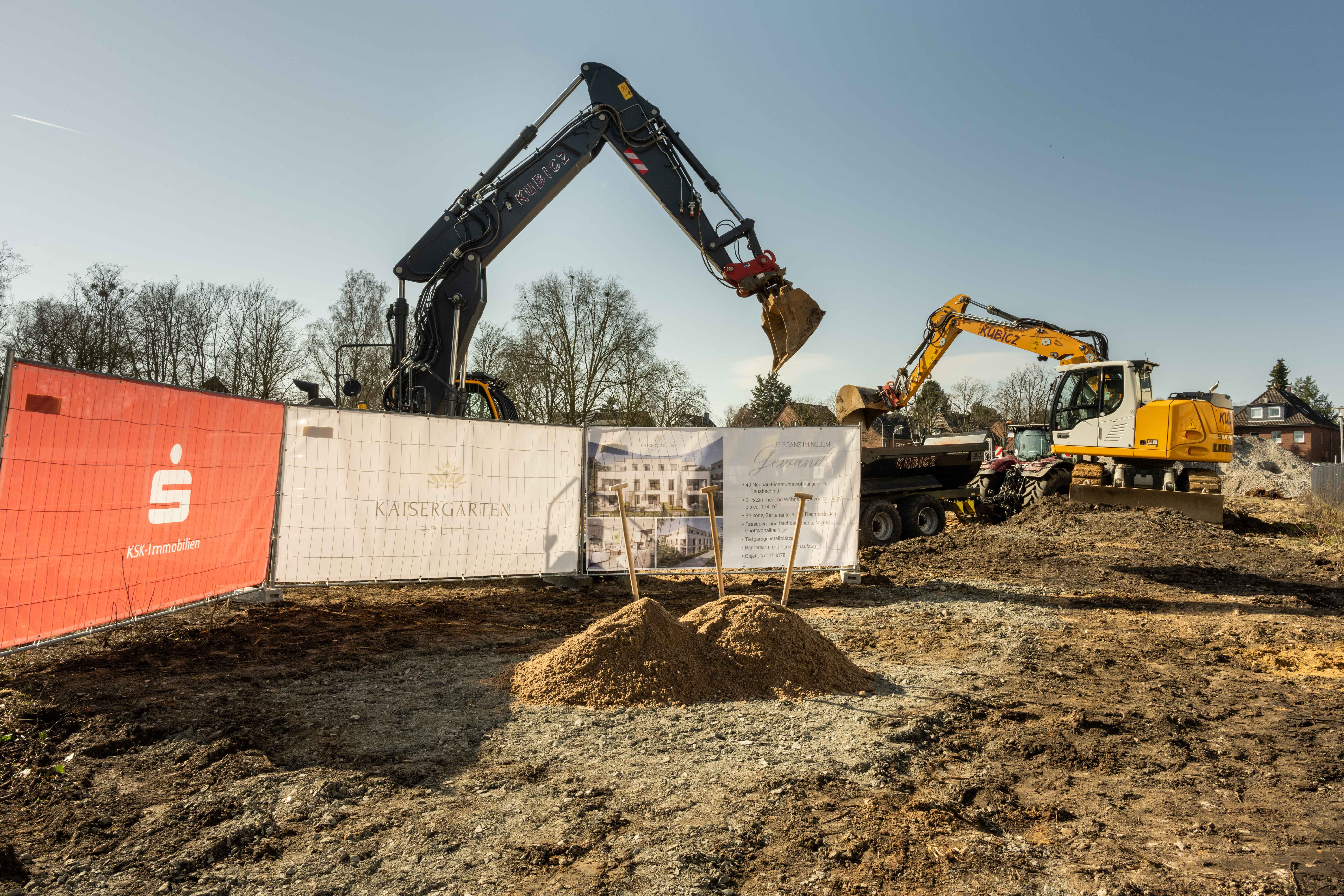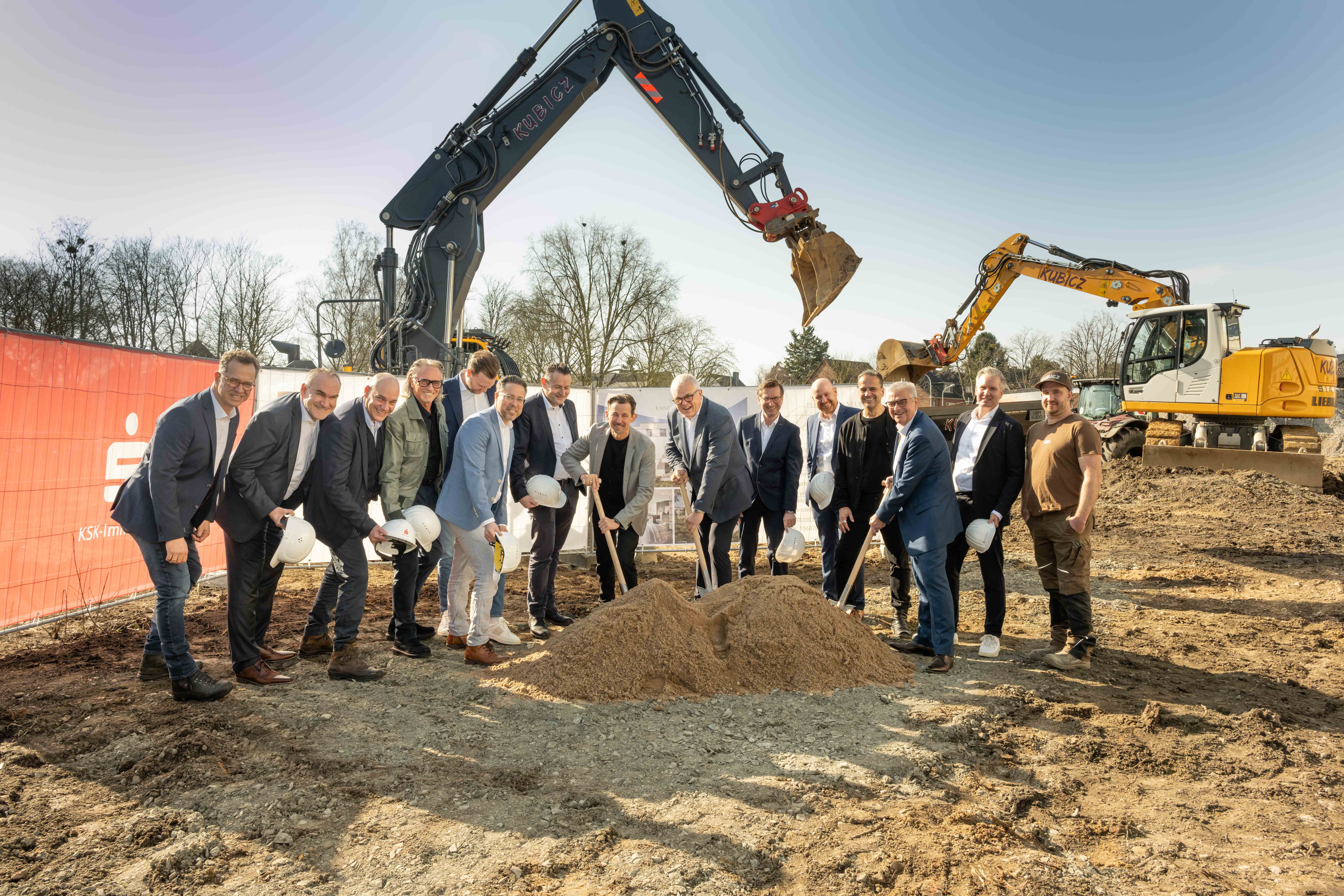 Gemeinsam mit dem Brühler Bürgermeister Dr. Marc Prokop und mit Ralf Ritter, Beigeordneter der Stadt Brühl, setzten heute (27. Februar) Udo Buschmann, Mitglied des Vorstandes der Kreissparkasse Köln, sowie Thomas Köppinger und Mark Kellringer, Geschäftsführer der Projektgesellschaft SERETO GmbH, den symbolischen ersten Spatenstich. Hinter der SERETO, Projektentwickler der Kaisergärten, stehen die KSK-Real Estate Management GmbH (KSK-REM), eine 100 prozentige Tochter der Kreissparkasse Köln, und die SEDOS GmbH, Projektentwickler aus Rheinbach.